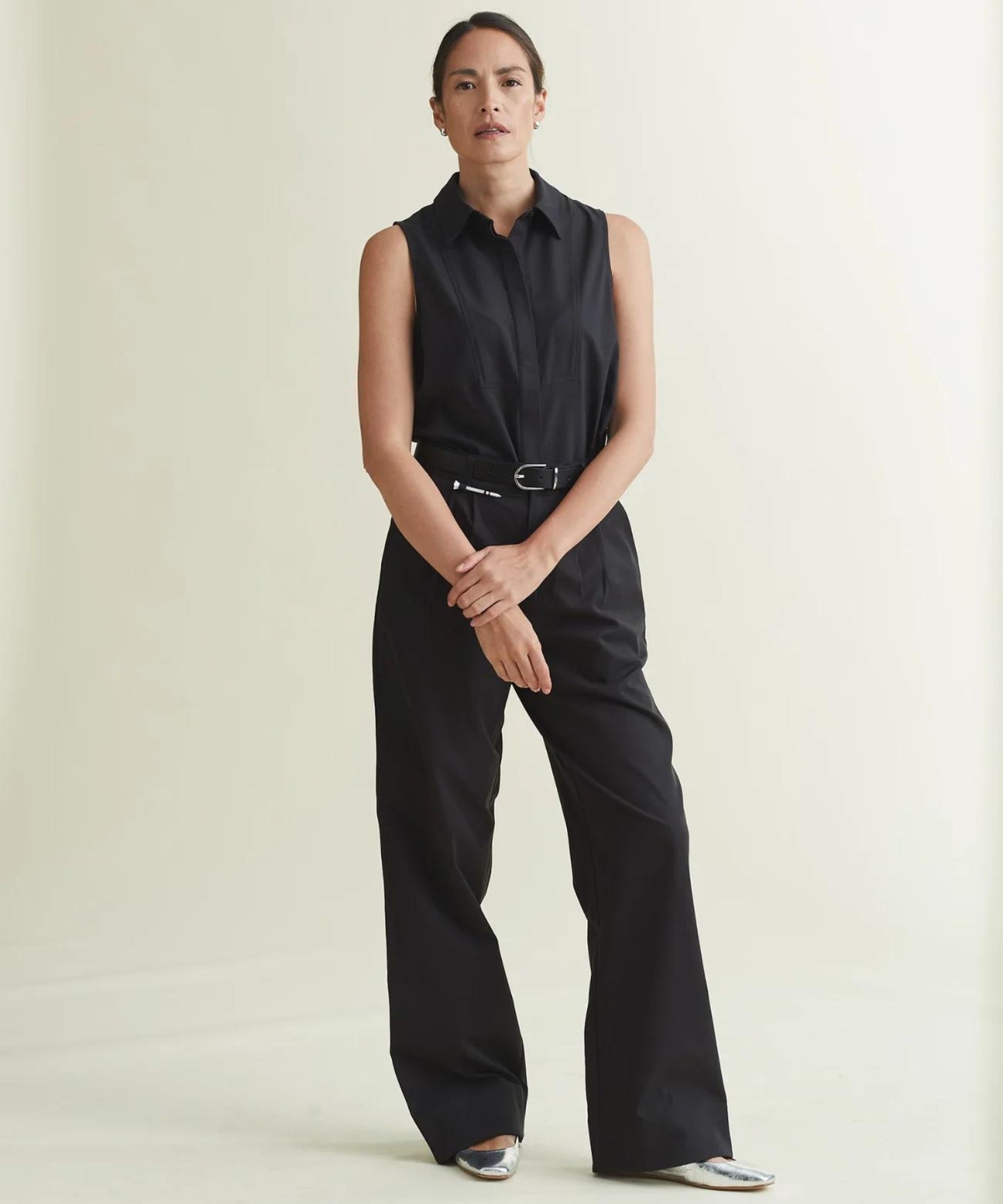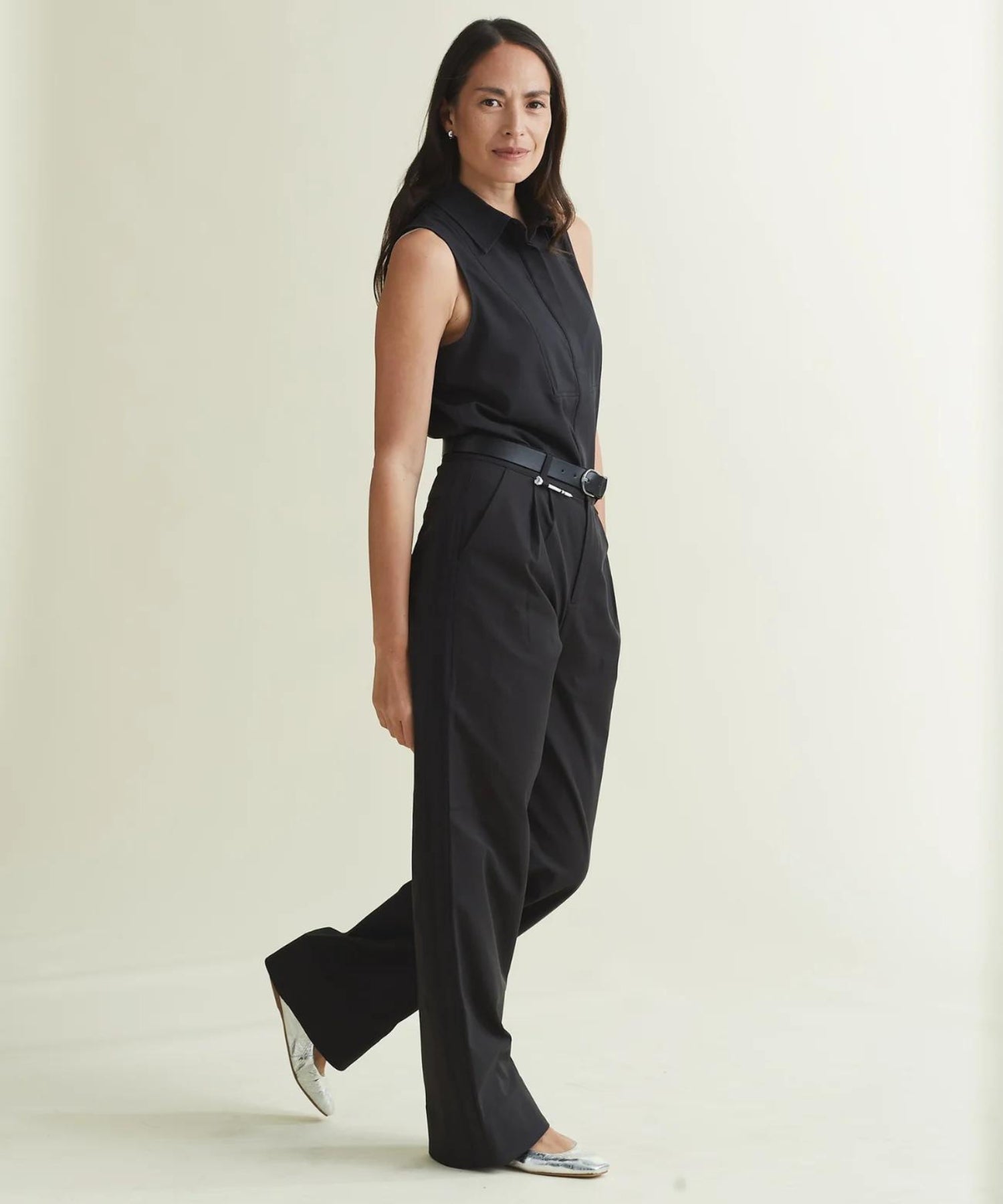 For the shoot, Ali sported two standout pieces: the Black Sleeveless Tux and the Asti Trouser. The Black Sleeveless Tux is a timeless piece, tailored with precision to offer a polished yet comfortable fit. It’s one of those versatile wardrobe staples that can easily transition from day to night, whether you’re at work or attending a formal event. Paired with the Asti Trouser, the look becomes even more elevated. The Asti Trouser, with its wide-leg silhouette, tuxedo stripes, and 4-way stretch fabric, strikes the perfect balance between comfort and sophistication. It’s wrinkle-resistant and water-repellent, making it the ideal choice for all-day wear.